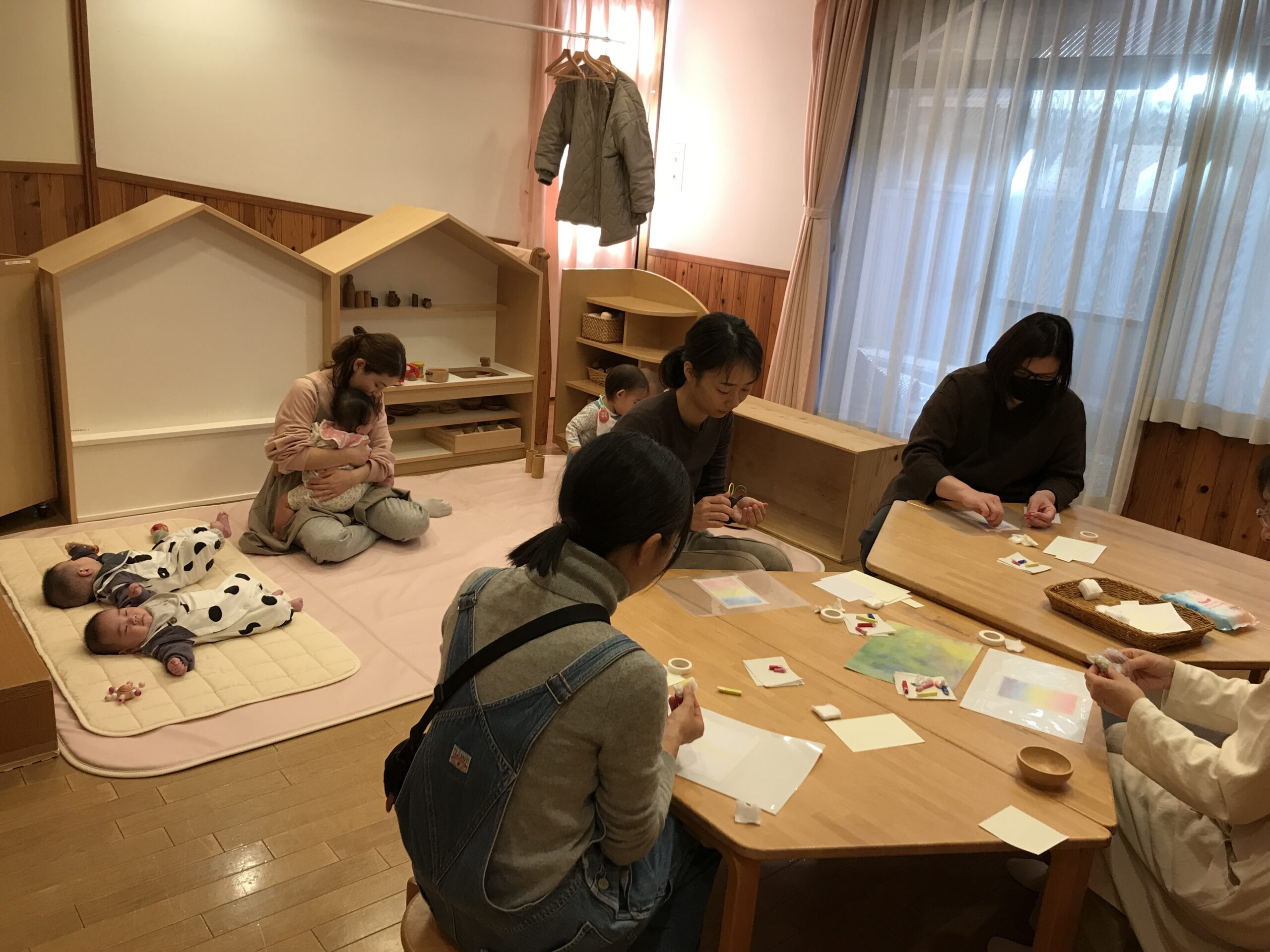 パステルの色と色を丁寧に広げ、重ね合わせていく手仕事は、ついつい夢中になります。自分の手から作り出された色は世界にひとつ。こどもたちのことは保育者にお任せしているためか、みなさんじっくり、ゆったり取り組んでいました。こども達はというと保育者が見守る中、お気に入りのおもちゃを見つけて遊んだり、年下の子におもちゃを渡してあげたりしていました。