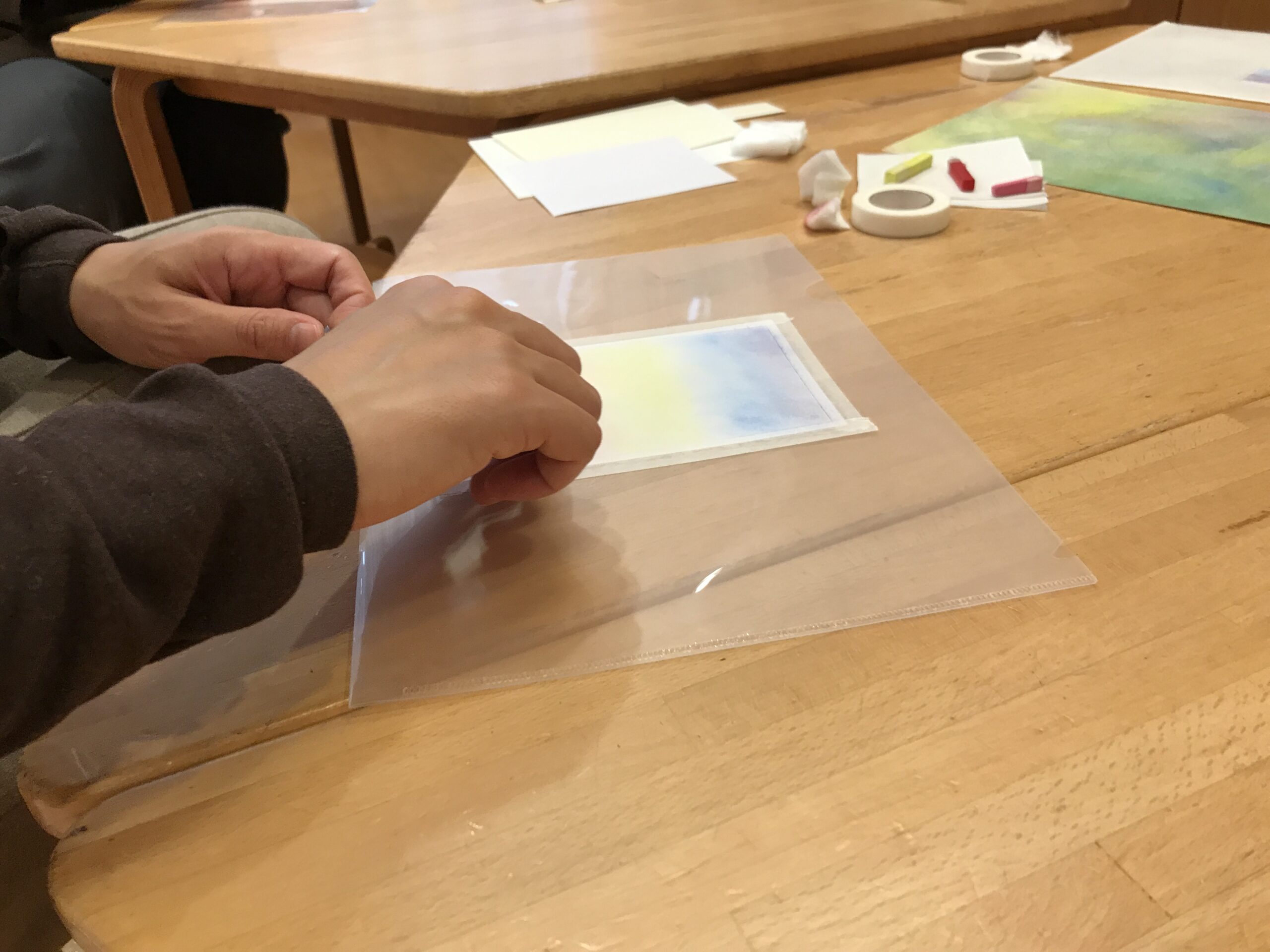 パステルで絵を描き終えると、紙をとめていたテープをはがして完成です。描いている時とは違い、少し離れてみるとまた違う作品のように見えます。