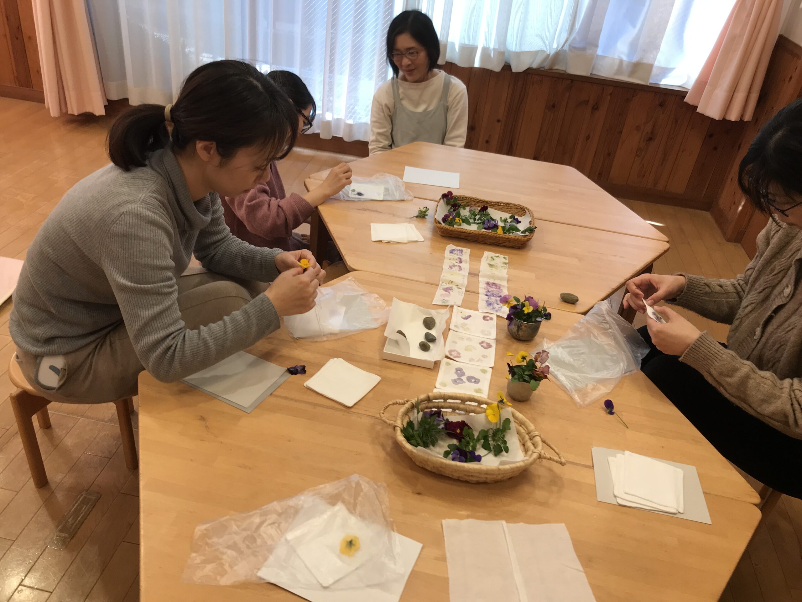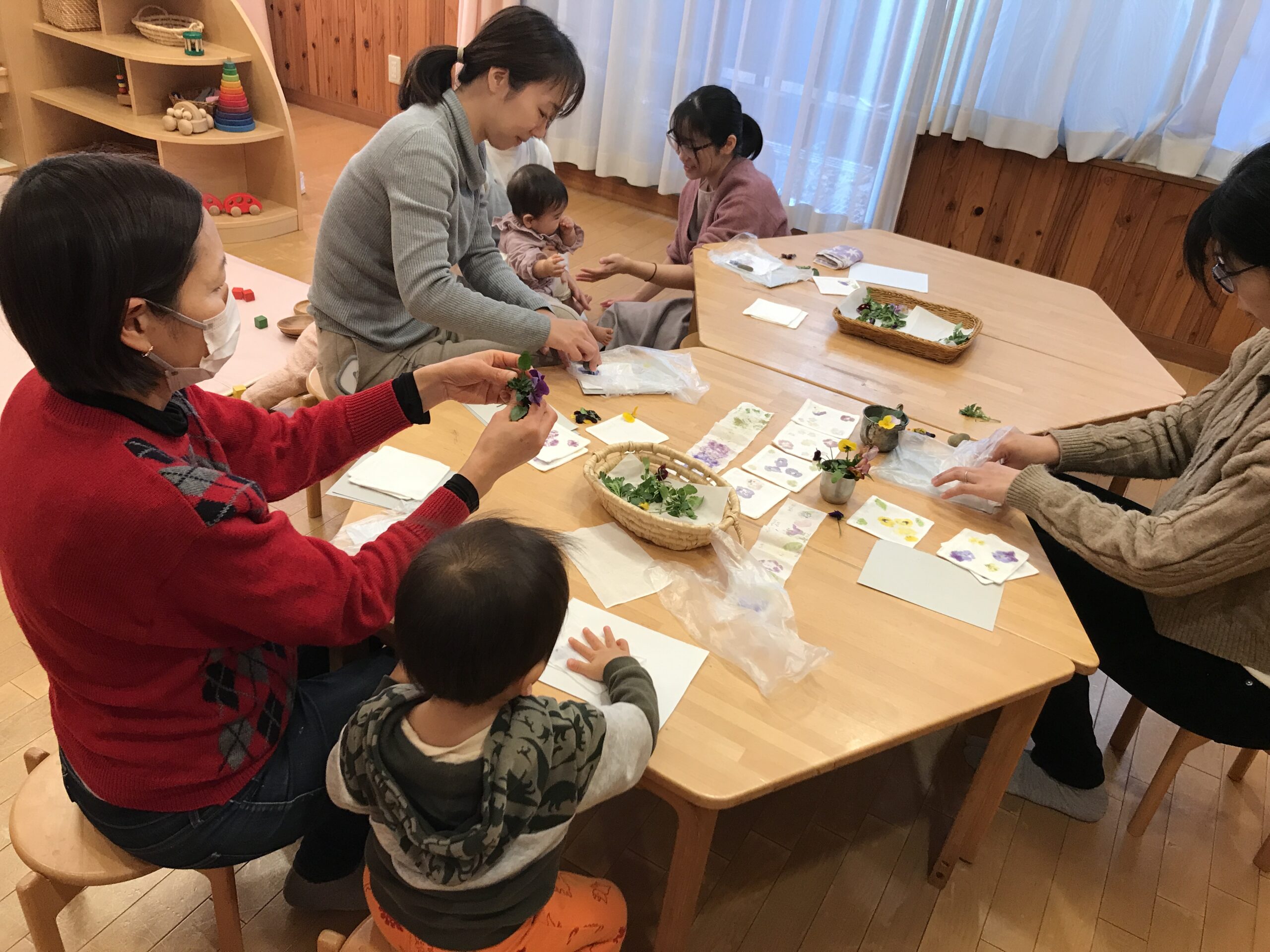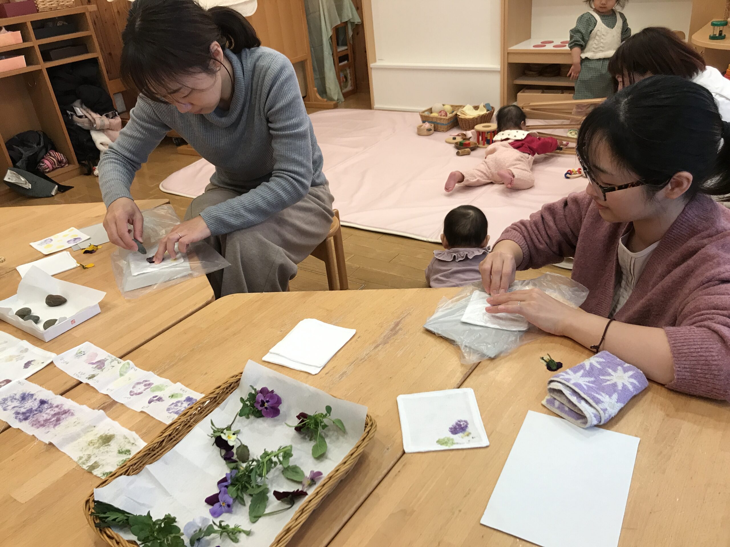 お母さんがお花の染めをしている所に近づいて「においがする」とつぶやく子どもの声に「いいにおいだね」とお母さんが応える姿がとても素敵でした。