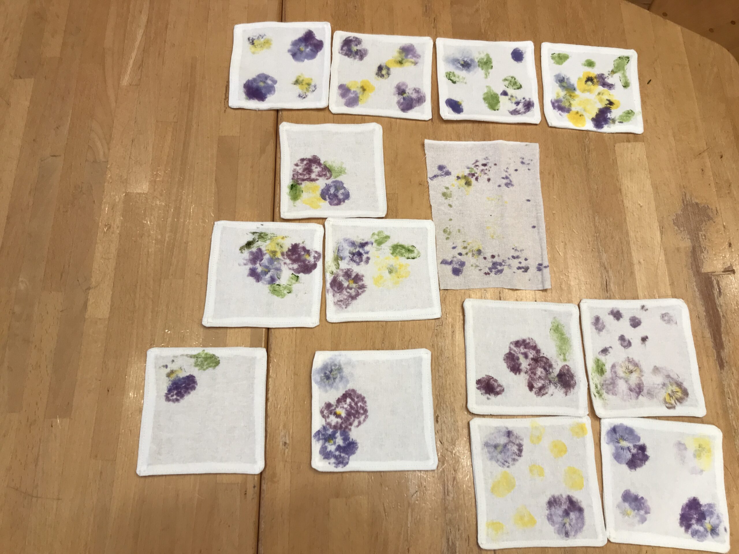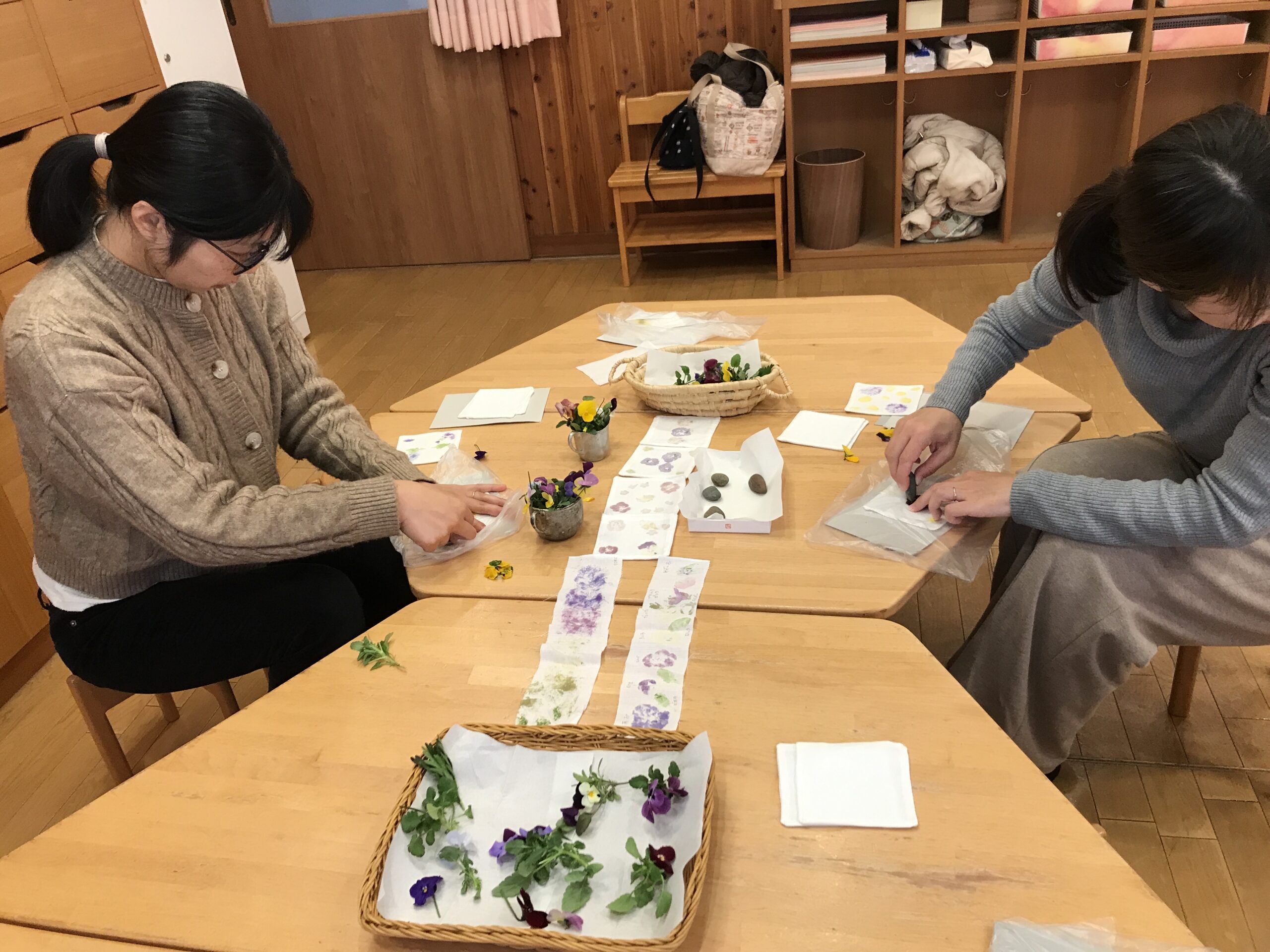 園庭のビオラを使ってたたき染めをしました。花の色を布に写し取ります。
