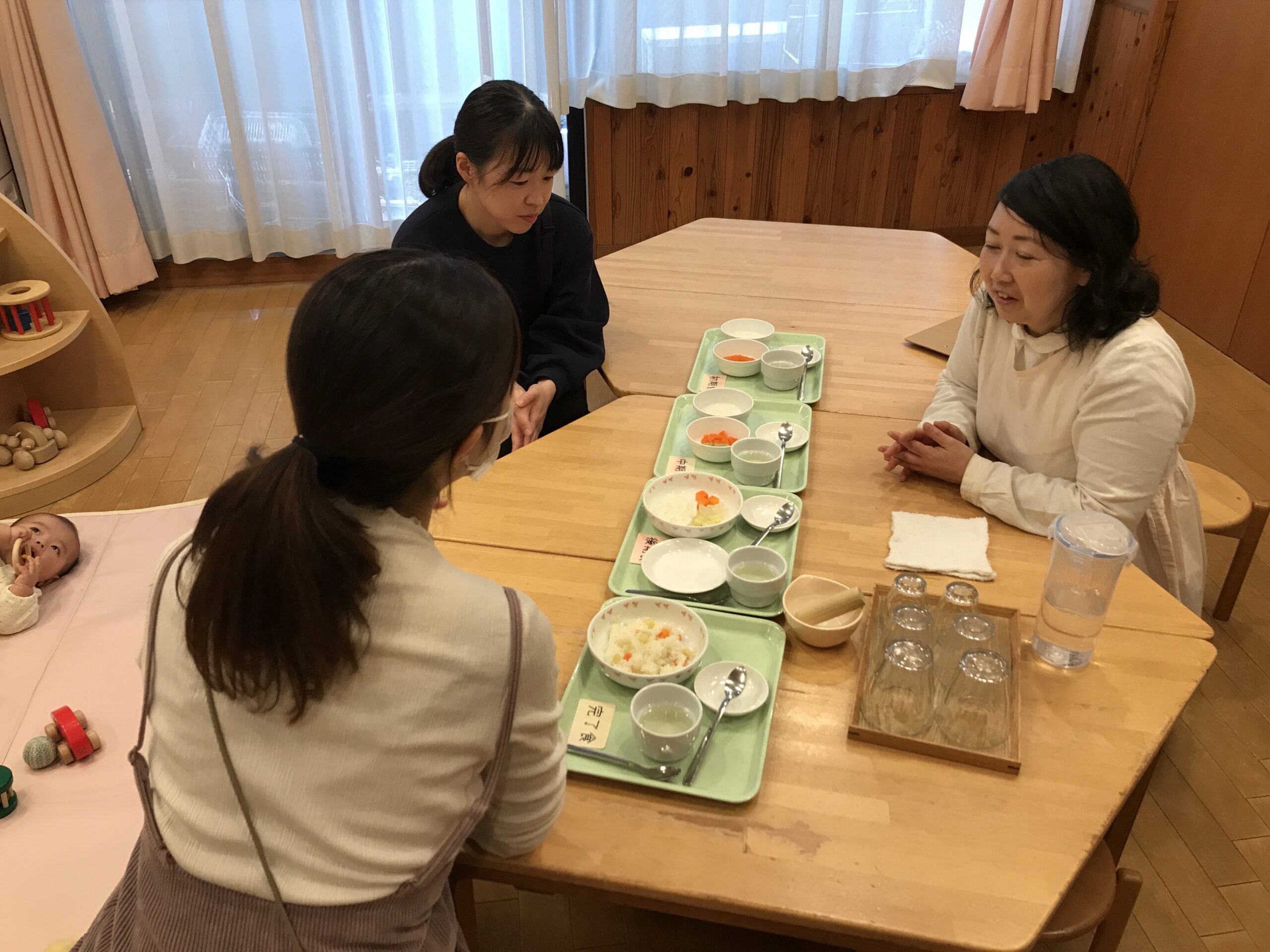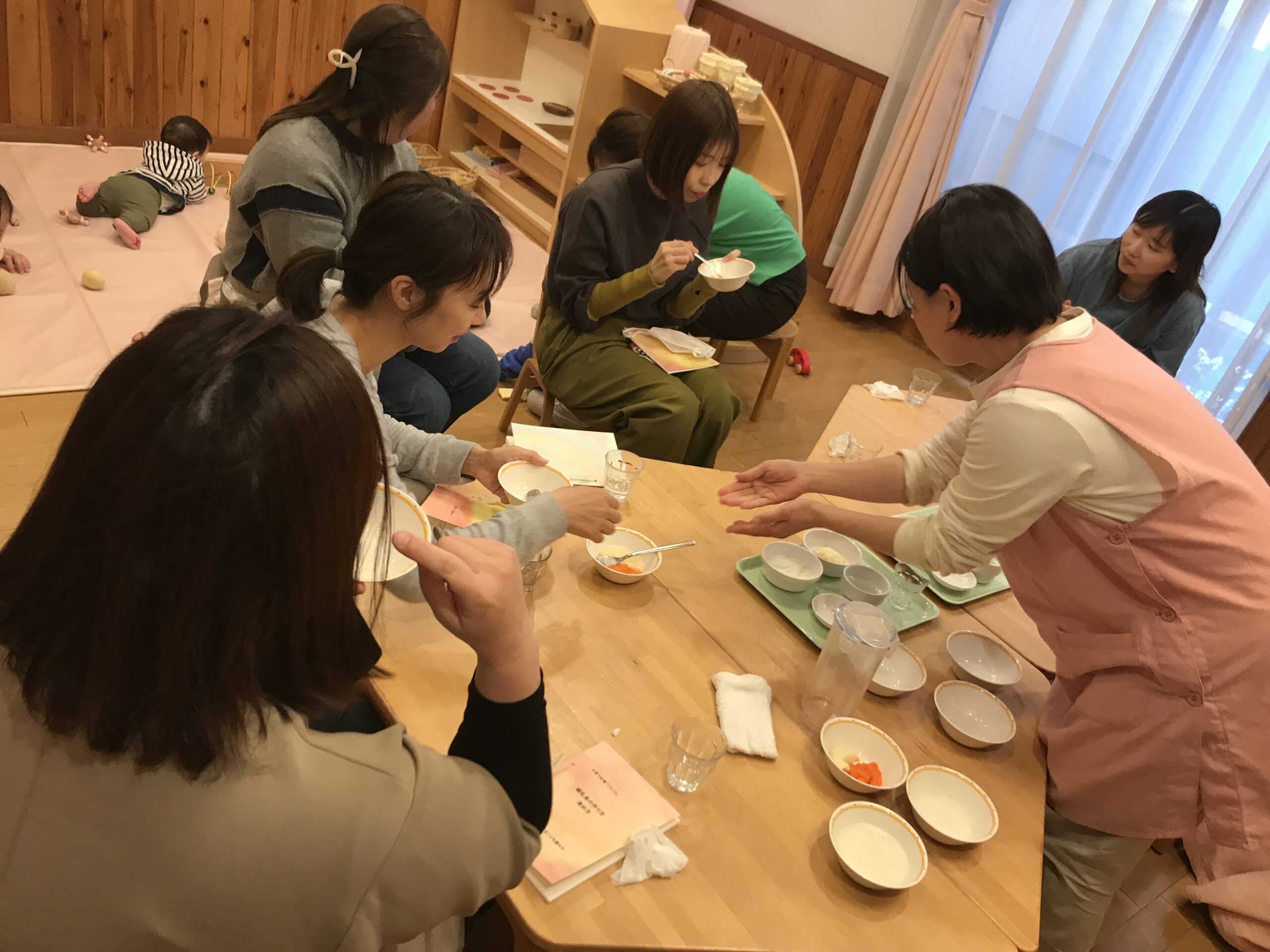 モモの子ども達が食べている、離乳食を形態毎に見ていただき実際に試食してもらいました。