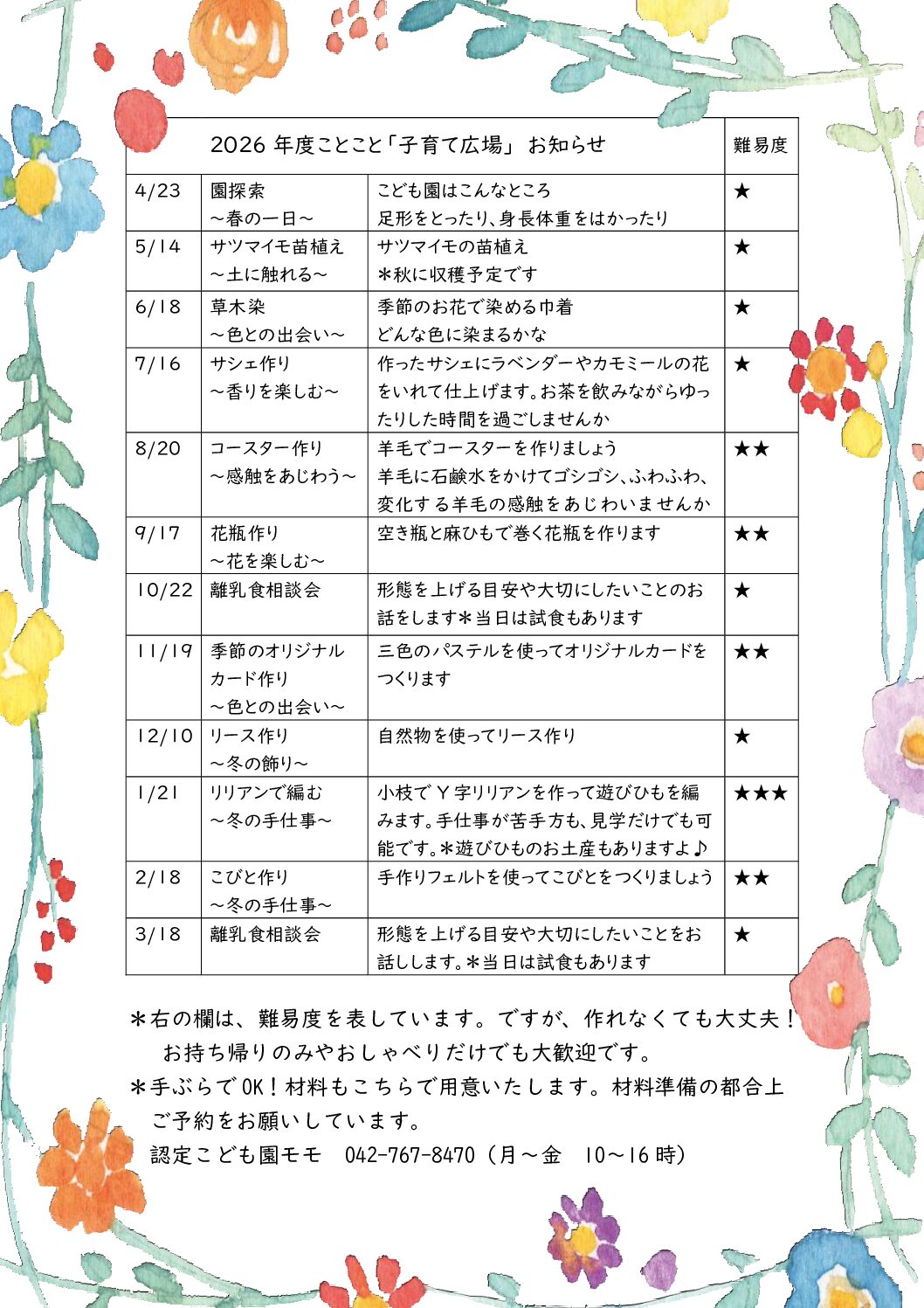 今年度も「ことこと」では、出会いを大切に静けさと温もりのある空間の中でゆったりと手仕事や語らいをしたいと考えております。子育ては家庭だけでなく、地域社会全体でしていくものだと思っております。暮らしの中で、「もう一つの居心地のいい場所」を加えてみませんか?